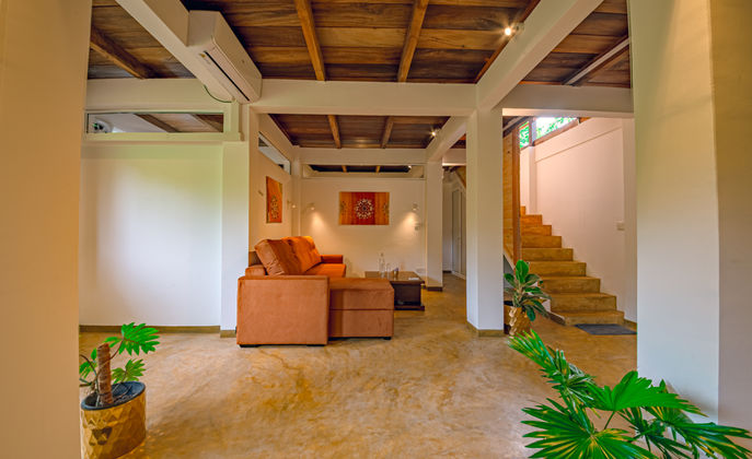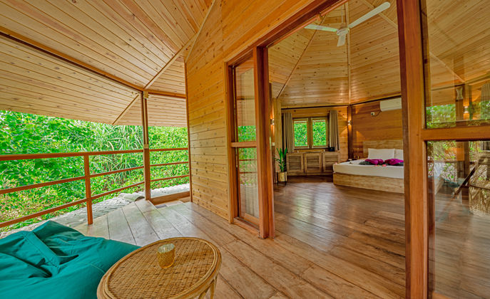 Surrounded by the sights and sounds of the jungle, this beautifully designed cabana offers generous living space for up to 6 guests, blending rustic charm with modern luxury. The interiors are thoughtfully crafted to provide a warm, relaxing atmosphere, while large openings invite natural light and fresh jungle air.